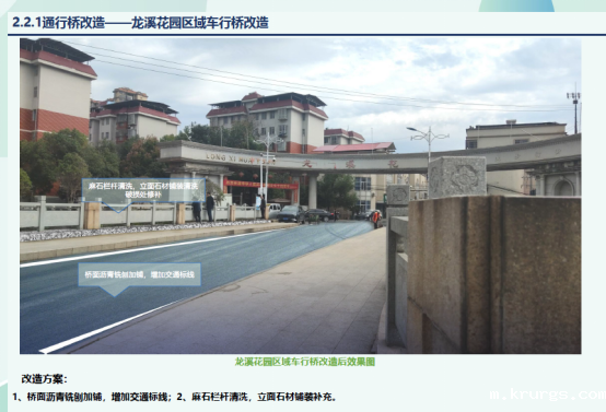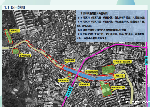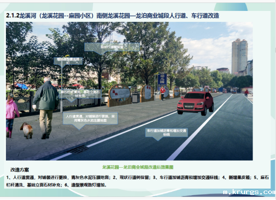 目主要改造内容:1、龙溪河(龙溪花园一麻园小区)南北两侧车行道、人行道改造;2、龙溪河(龙溪花园-麻园小区)间五座通行桥、经营摊点、路灯照明改造;3、体育坪健身公园空间改造及生态停车场改造;4、水电设备厂生活小区、龙泊湾小区、新华书店小区、老水利局小区、麻园小区等5个小区基础设施改造等。