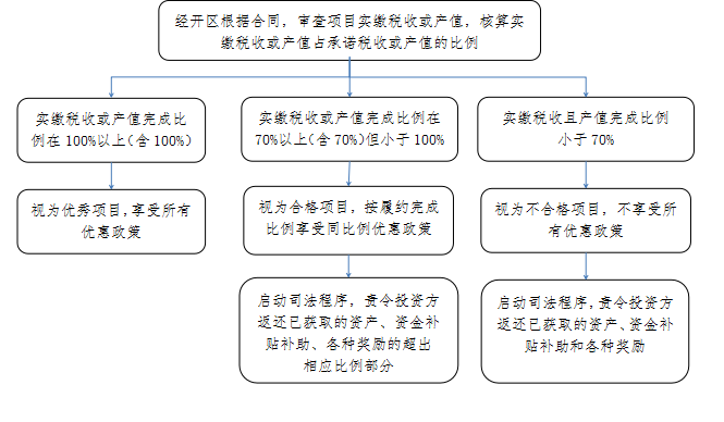 第二十一条 退出机制。招商项目建成投产(用地项目2年内投产,租赁厂房项目1年内投产,重特大项目根据“一事一议”有合同约定的除外)后约定年度内实缴税收且产值没有达到合同约定数额的70%的,视为不合格项目,启动项目退出机制,由经开区根据税务部门提供的实缴税收证明或实缴税收关联的营业收入证明,对照合同进行审查审定后,责令投资方将已获取的各种资产、资金补贴补助和各种奖励返还;实缴税收或产值达到本合同约定数额的70%以上(含70%的)但没有达到100%的,视为合格项目,可按履约完成比例享受优惠政策,由经开区根据税务部门提供的实缴税收证明或实缴税收关联的营业收入证明,对照合同进行审查审定后,责令投资方将已经获取的各种资产、资金补贴补助和各种奖励中超过相应比例的部分返还。