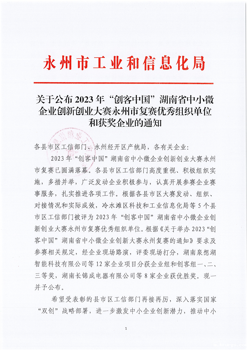 名称: 湖南省创新创业大赛永州市复赛优秀组织单位和获奖企业